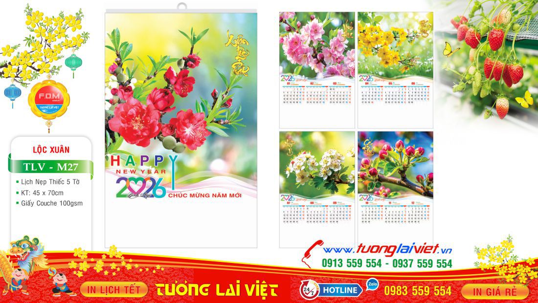 Lịch 5 tờ nẹp thiếc thường được in Offset 1 mặt trên giấy C105gsm, có kích thước: 36×70 và 45x70cm. Lịch 5 tờ Lộc xuân là mẫu lịch tờ treo tường giá rẻ nên được nhiều cửa hàng nhỏ lẻ chọn in lịch tết năm nay để làm quà tặng cuối năm cho khách hàng, bạn bè, đối tác và người thân nhân dịp năm mới.