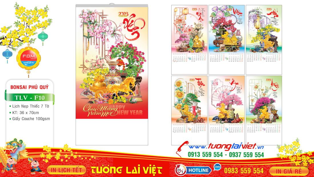 Lịch 7 tờ nẹp thiếc thường được in Offset 1 mặt trên giấy C105gsm, có kích thước: 36×70 và 45x70cm. Lịch 7 tờ Bonsai là mẫu lịch tờ treo tường giá rẻ nên được nhiều cửa hàng nhỏ lẻ chọn in lịch tết năm nay để làm quà tặng cuối năm cho khách hàng, bạn bè, đối tác và người thân nhân dịp năm mới.