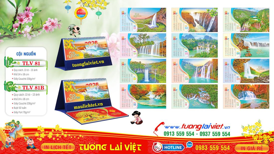 Mẫu Lịch Bàn 13 Tờ Cội Nguồn thường được in trên Giấy Couche định lượng 230gsm và Đế Lịch làm bằng Mdf bồi giấy in Metalize. Mẫu Lịch Để Bàn 13 Tờ được In TLV sản xuất theo kích thước 24×18 và 19×22. Bên cạnh đó thường có 2 kiểu dáng: Lịch Để Bàn chữ A và Lịch Để Bàn chữ M có thêm phần Note Ghi Chú bên dưới.