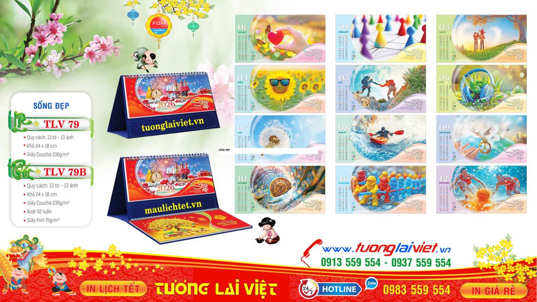 In Lịch Để Bàn năm nay được In TLV thiết kế phong phú về chủ để với những hình ảnh như: Bon Sai, Tài Lộc, 12 Con Giáp, Nhà và Xe, Phong Thuỷ, Chữ Thư Pháp, Hoa Sen, Phong cảnh, Du Lịch, Danh Ngôn Cuộc Sống, Lời Hay Ý Đẹp, Ca dao Tục Ngữ, Nội Thất, Thuận Buồm Xuôi Gió, Phúc Lộc Thọ, Phật Di Lặc, Logistics Vận Chuyển, …